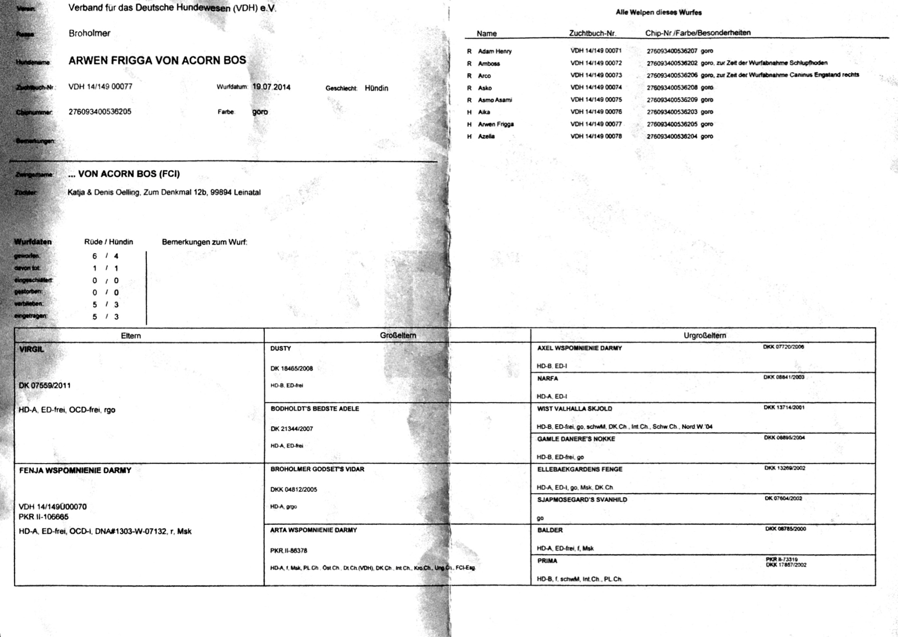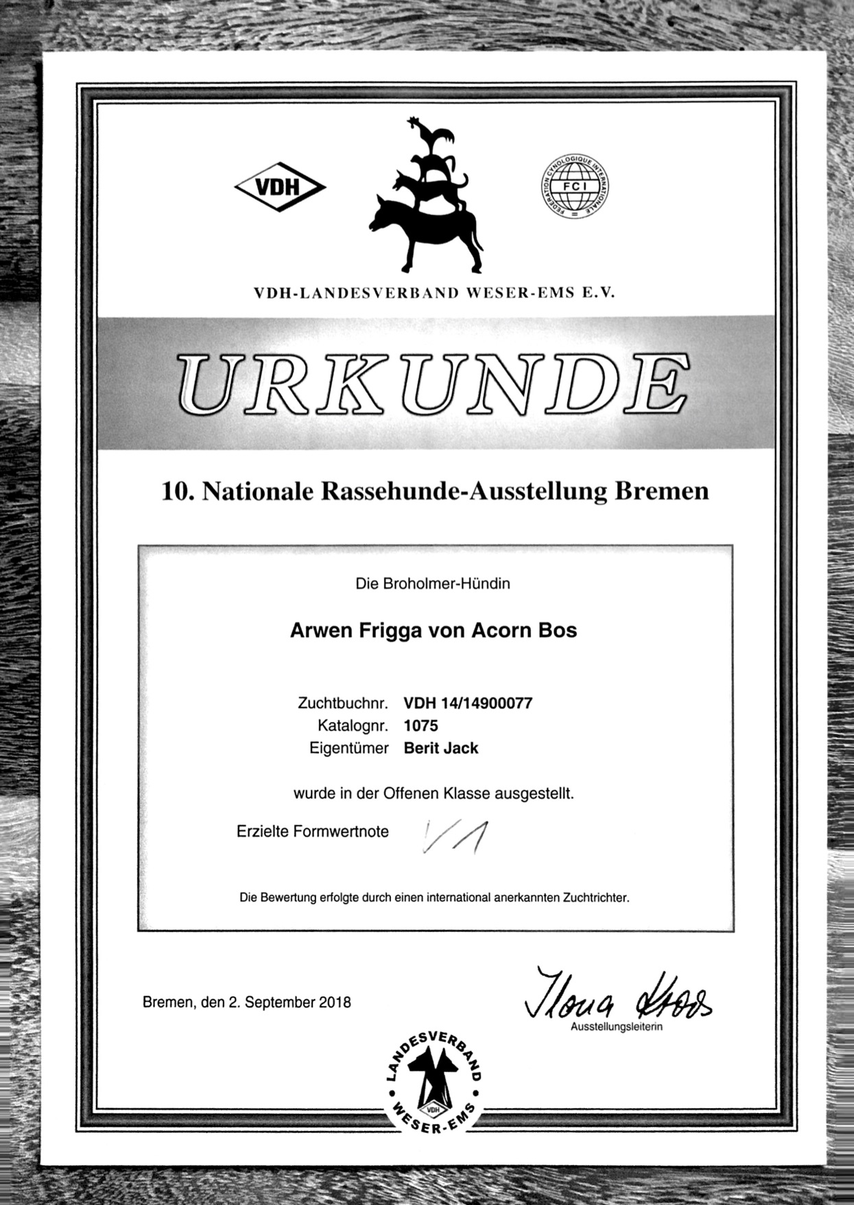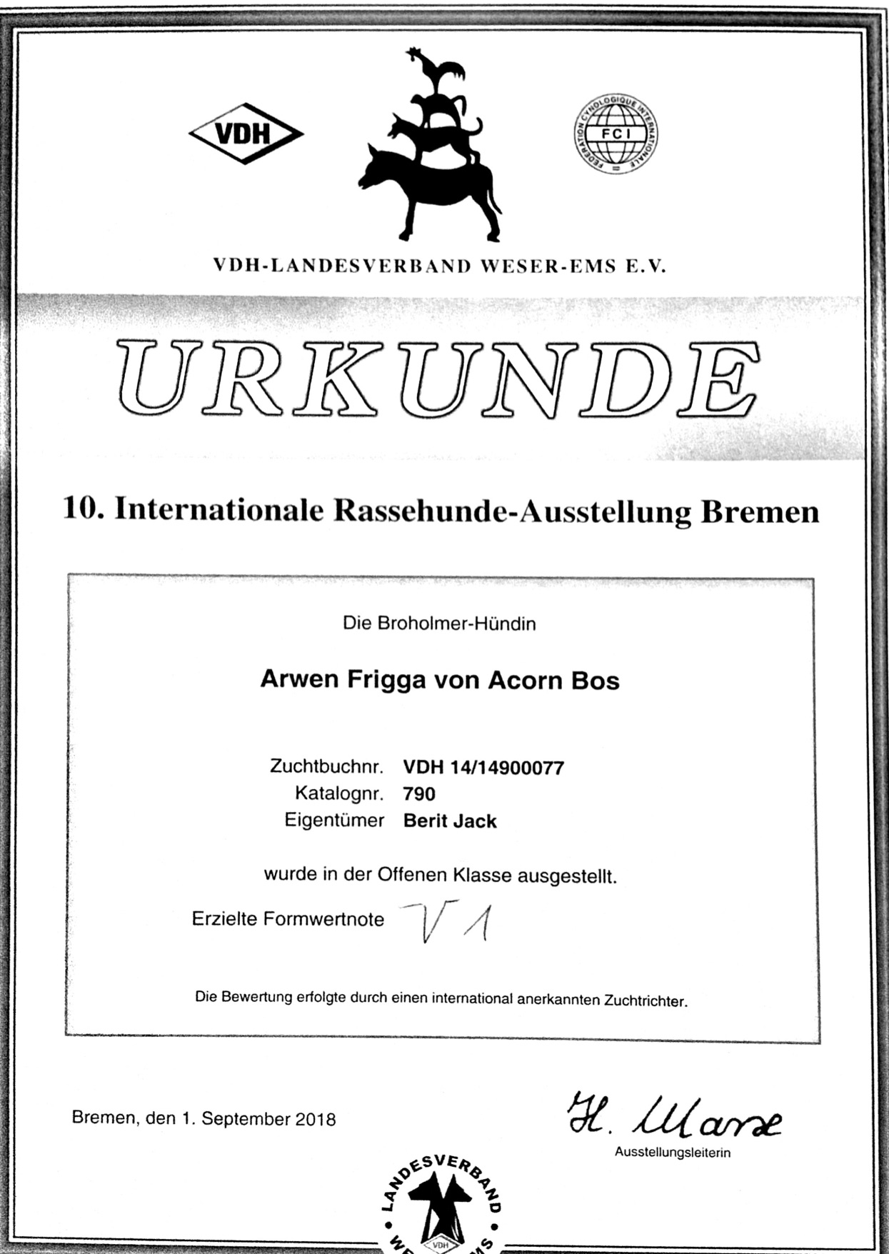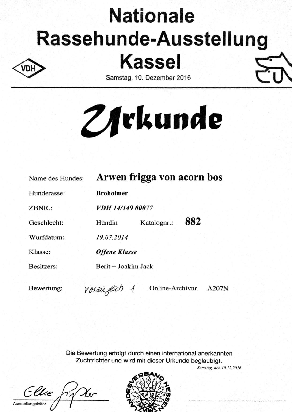 ....heißt eigentlich ARWEN Frigga von Acorn Bos. ARWEN....weil es der A_Wurf war und der nun mal mit A anfangen muss... Aber Warum Frigga? Für mich besitzen Namen eine enorme Beutung....und deshalb wollen sie sorgfältig ausgewählt werden: Frigga.. Frigga ist die Göttin der Fruchtbarkeit, der Liebe und des Lebens, sowie der Ehe und der Mütter Friggas Attribute sind ein Falkengewand, welches ihr die Möglichkeit bietet hinfort zu fliegen, sowie eine magische Spindel, die es ihr ermöglicht die Schicksalsfäden zu spinnen, welche dann von den Nornen, den Schicksalsgöttinen, verwoben werden. Sie besitzt auch einen von Hunden oder Widdern gezogenen Streitwagen. Friggas Dienerinnen sind sowohl Sigyn, Vara, Eira, Hlin, Lofn und Vjofn, als auch Gna, Fulla und Syn. Wenn sie zusammen mit Odin die Erde besucht, bringt sie Glück in die Häuser. Frigga besitzt die Gabe der Voraussicht. Sie kennt das Schicksal aller Wesen, schweigt aber darüber. Schon seit jeher besitzt sie das Wissen über die Zukunft, will es den Asen jedoch nicht preisgeben, um sie nicht zu beunruhigen. Nicht einmal Odin verrät sie die Zukunft. Frigga wohnt im Palast Fensal ("Sumpfsääle"), wo sie unter anderem Liebende zusammenführt, deren Liebe auf Erden keine Erfüllung findet. Genau deshalb heißt unsere Zuchtstätte ...