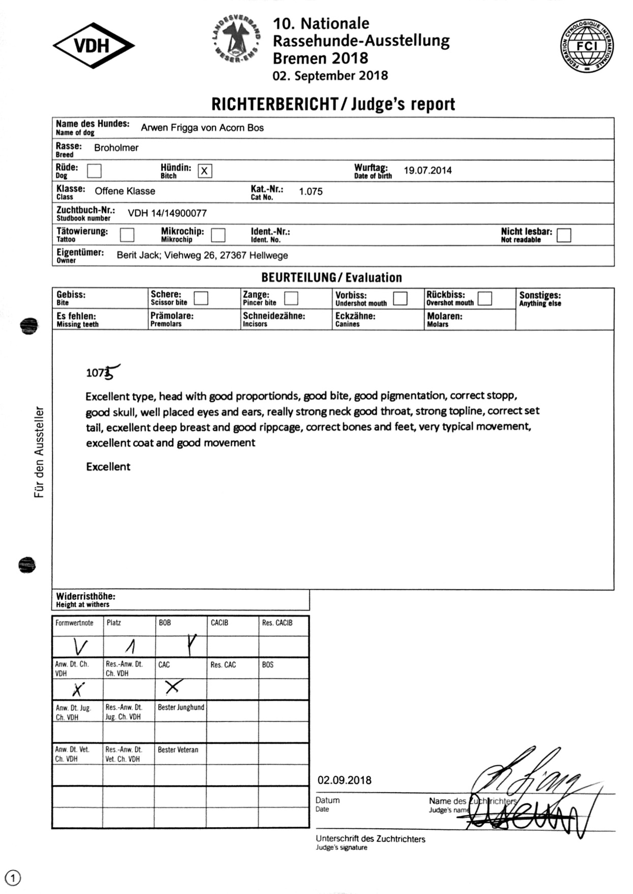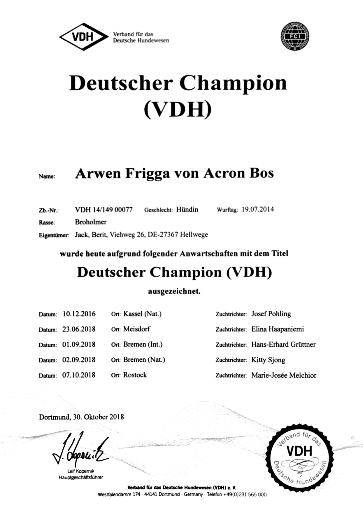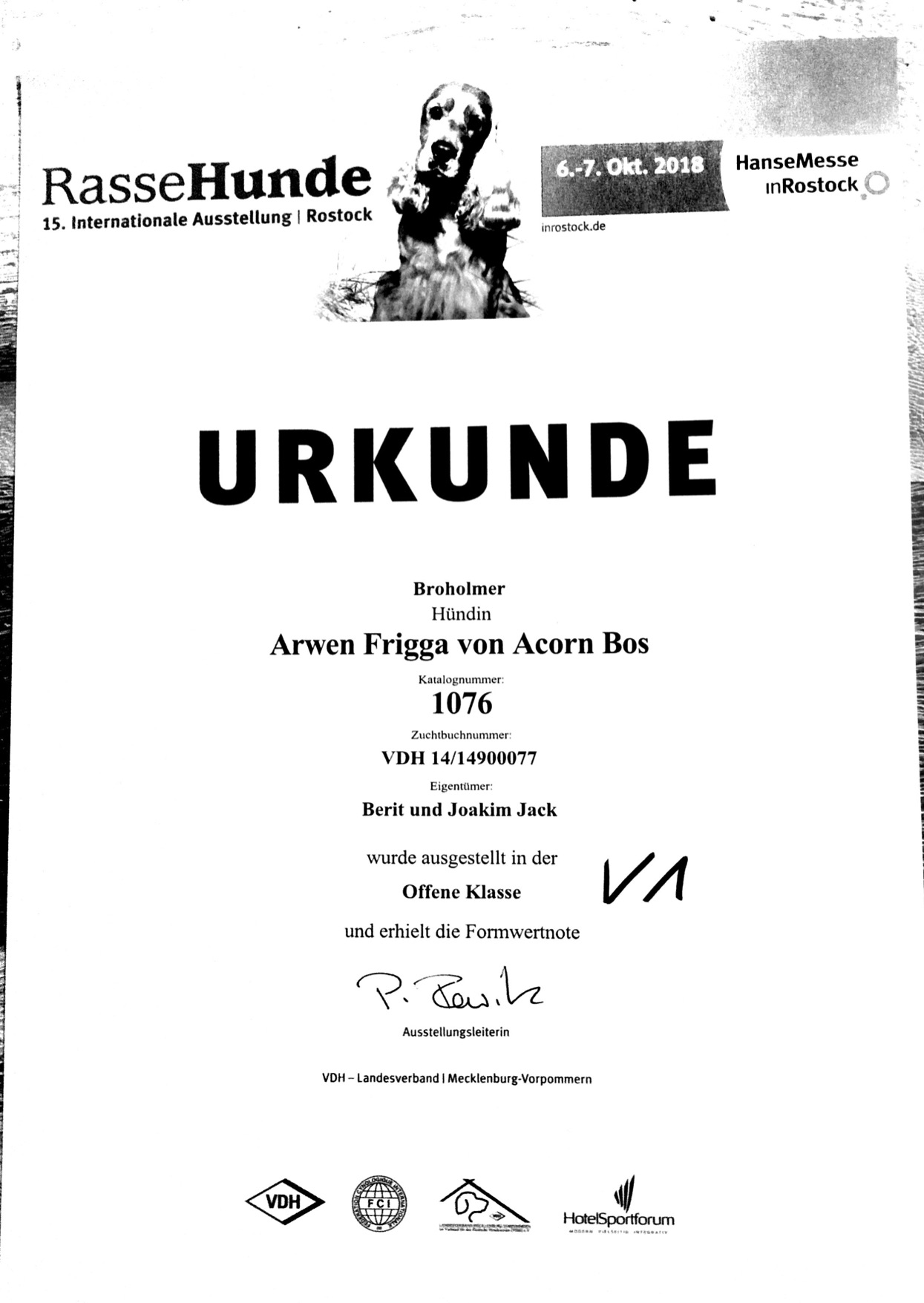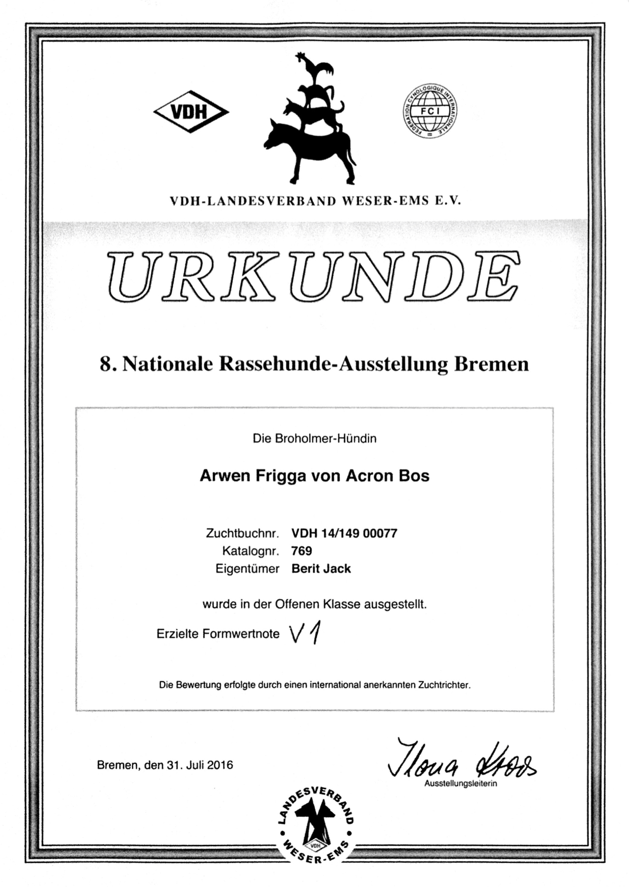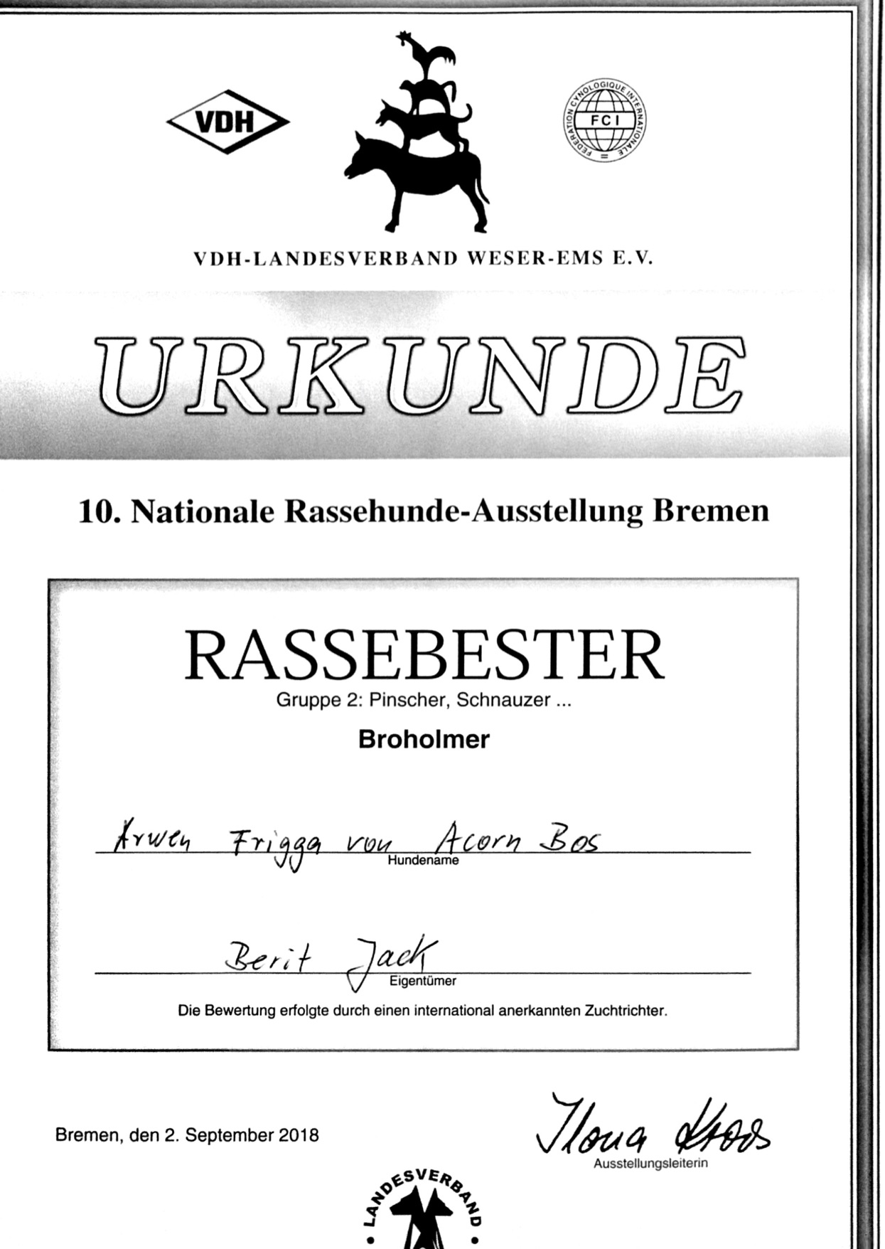 ....heißt eigentlich ARWEN Frigga von Acorn Bos. ARWEN....weil es der A_Wurf war und der nun mal mit A anfangen muss... Aber Warum Frigga? Für mich besitzen Namen eine enorme Beutung....und deshalb wollen sie sorgfältig ausgewählt werden: Frigga.. Frigga ist die Göttin der Fruchtbarkeit, der Liebe und des Lebens, sowie der Ehe und der Mütter Friggas Attribute sind ein Falkengewand, welches ihr die Möglichkeit bietet hinfort zu fliegen, sowie eine magische Spindel, die es ihr ermöglicht die Schicksalsfäden zu spinnen, welche dann von den Nornen, den Schicksalsgöttinen, verwoben werden. Sie besitzt auch einen von Hunden oder Widdern gezogenen Streitwagen. Friggas Dienerinnen sind sowohl Sigyn, Vara, Eira, Hlin, Lofn und Vjofn, als auch Gna, Fulla und Syn. Wenn sie zusammen mit Odin die Erde besucht, bringt sie Glück in die Häuser. Frigga besitzt die Gabe der Voraussicht. Sie kennt das Schicksal aller Wesen, schweigt aber darüber. Schon seit jeher besitzt sie das Wissen über die Zukunft, will es den Asen jedoch nicht preisgeben, um sie nicht zu beunruhigen. Nicht einmal Odin verrät sie die Zukunft. Frigga wohnt im Palast Fensal ("Sumpfsääle"), wo sie unter anderem Liebende zusammenführt, deren Liebe auf Erden keine Erfüllung findet. Genau deshalb heißt unsere Zuchtstätte ...