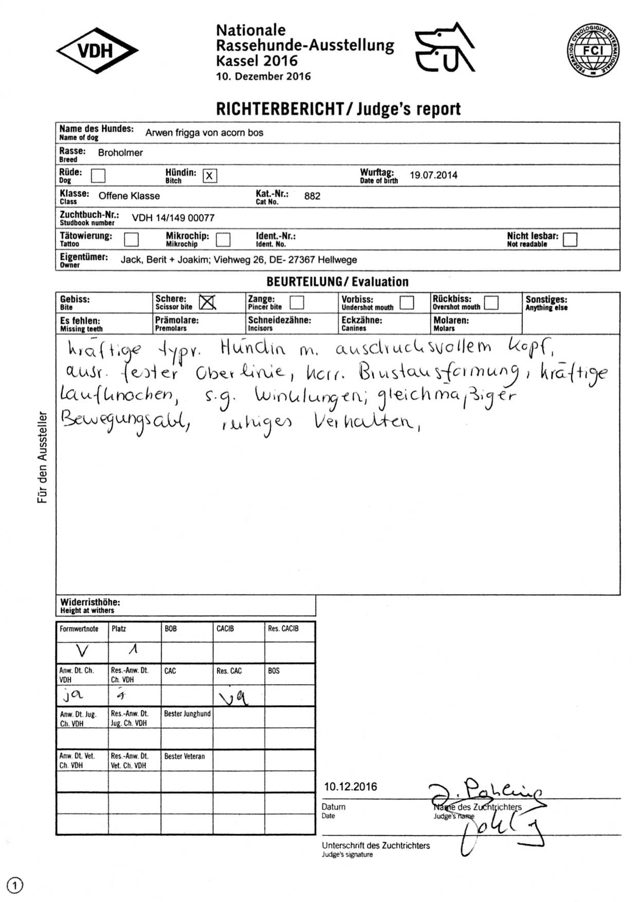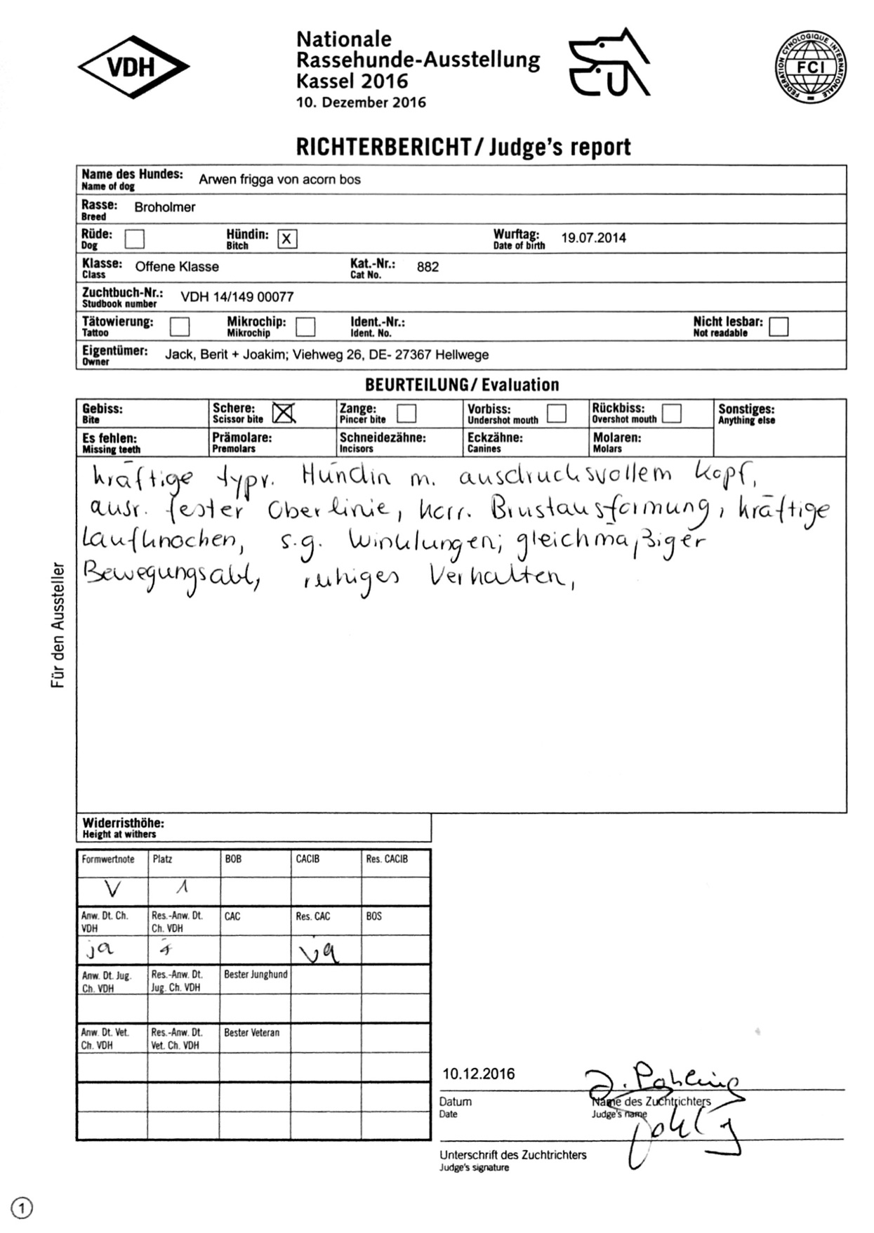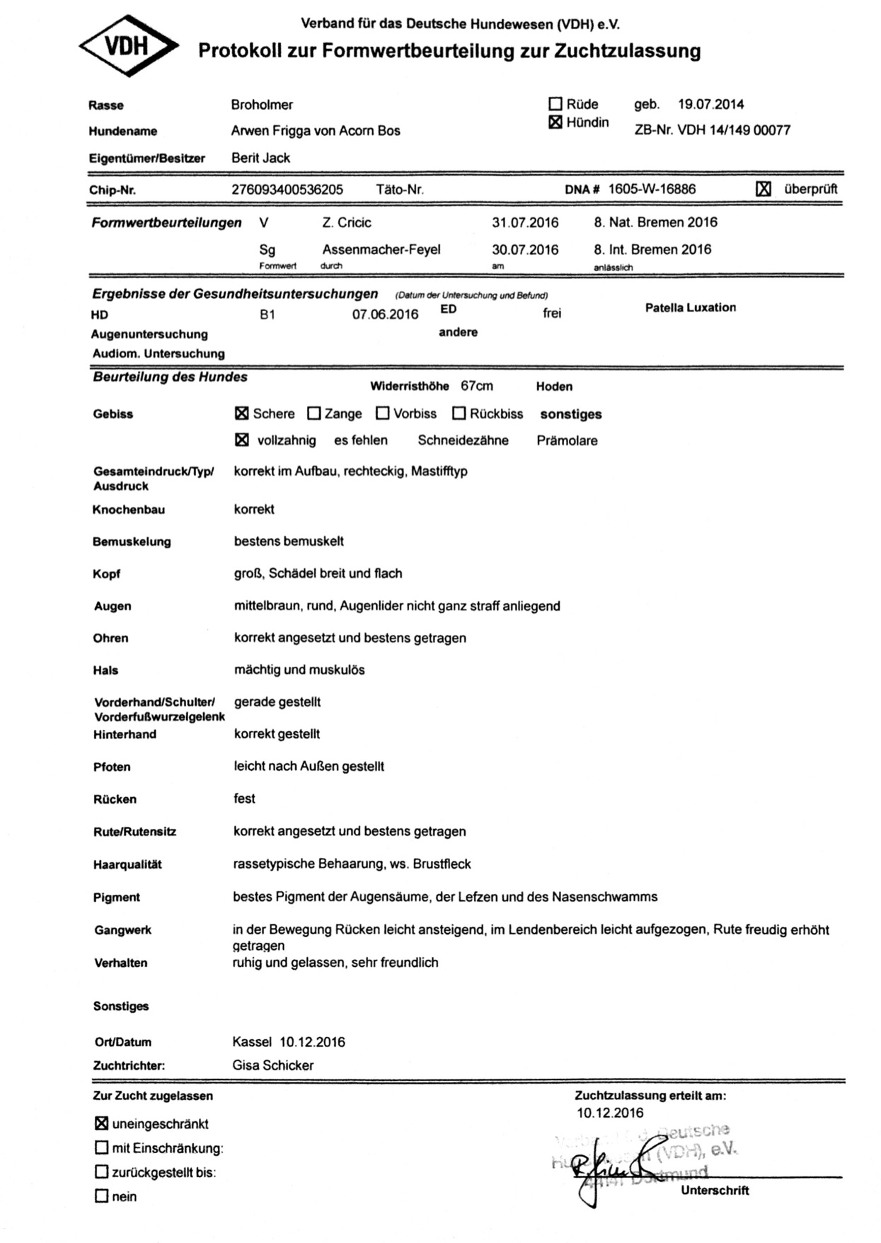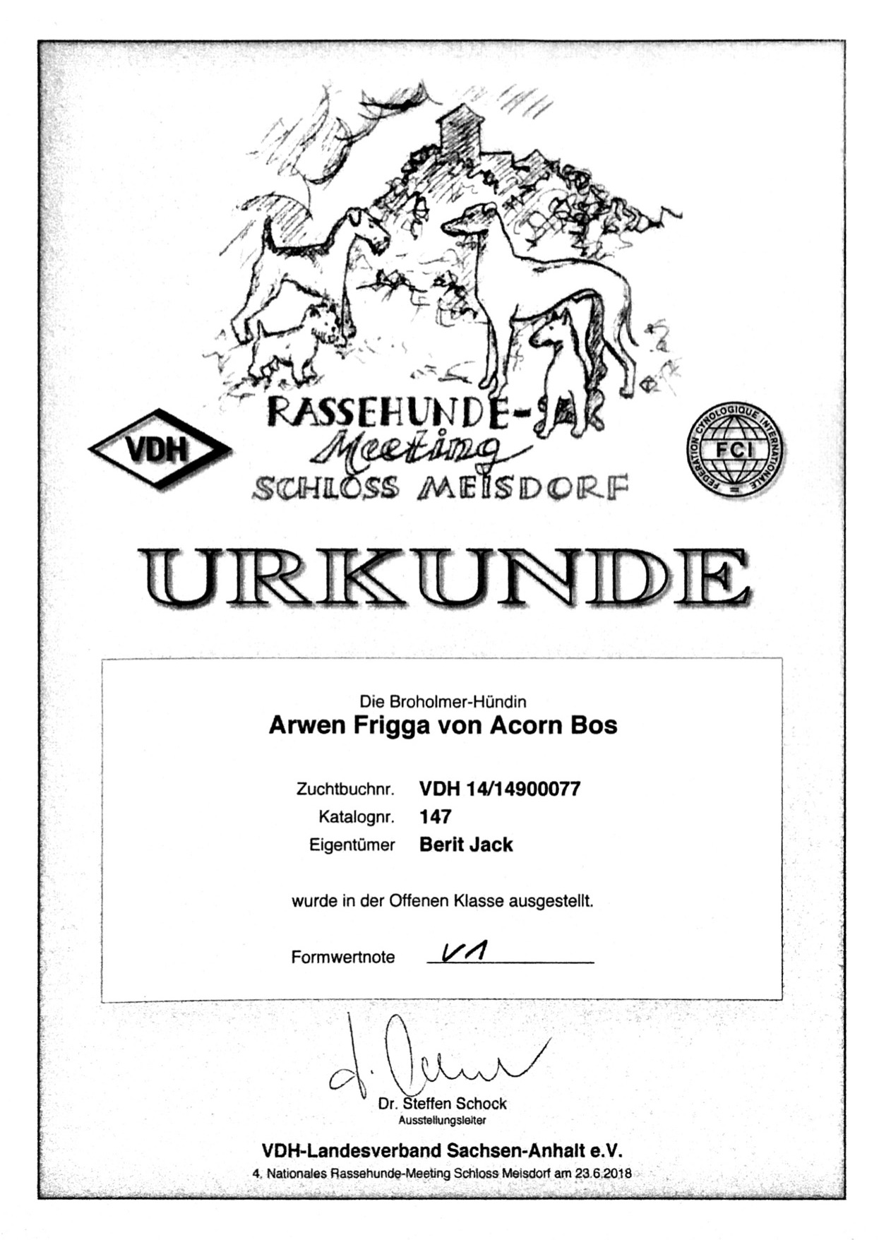 ....heißt eigentlich ARWEN Frigga von Acorn Bos. ARWEN....weil es der A_Wurf war und der nun mal mit A anfangen muss... Aber Warum Frigga? Für mich besitzen Namen eine enorme Beutung....und deshalb wollen sie sorgfältig ausgewählt werden: Frigga.. Frigga ist die Göttin der Fruchtbarkeit, der Liebe und des Lebens, sowie der Ehe und der Mütter Friggas Attribute sind ein Falkengewand, welches ihr die Möglichkeit bietet hinfort zu fliegen, sowie eine magische Spindel, die es ihr ermöglicht die Schicksalsfäden zu spinnen, welche dann von den Nornen, den Schicksalsgöttinen, verwoben werden. Sie besitzt auch einen von Hunden oder Widdern gezogenen Streitwagen. Friggas Dienerinnen sind sowohl Sigyn, Vara, Eira, Hlin, Lofn und Vjofn, als auch Gna, Fulla und Syn. Wenn sie zusammen mit Odin die Erde besucht, bringt sie Glück in die Häuser. Frigga besitzt die Gabe der Voraussicht. Sie kennt das Schicksal aller Wesen, schweigt aber darüber. Schon seit jeher besitzt sie das Wissen über die Zukunft, will es den Asen jedoch nicht preisgeben, um sie nicht zu beunruhigen. Nicht einmal Odin verrät sie die Zukunft. Frigga wohnt im Palast Fensal ("Sumpfsääle"), wo sie unter anderem Liebende zusammenführt, deren Liebe auf Erden keine Erfüllung findet. Genau deshalb heißt unsere Zuchtstätte ...